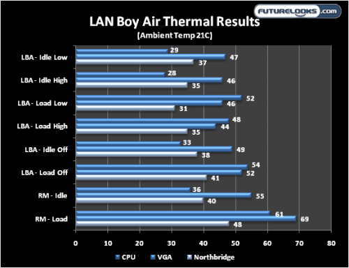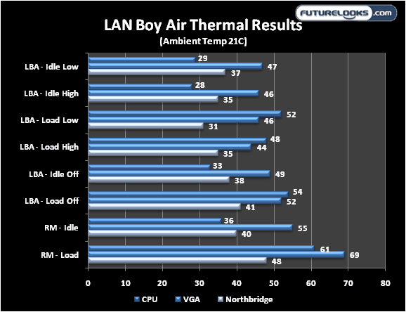 As you can see, the generic case is for the most part, a sad environment for a high performance system. It moved very little air and therefore allowed the system to get very hot and very loud. This is no place for a high performance gaming system. The LanBoy Air improved everything right away even without the fans going. This means that the case could potentially offer good performance to a passively cooled system. When the system fans were turned on, temperatures dropped even further.