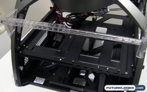 The rear of the Antec Skeleton holds even more promise for the computer gear-head. Hear we get to see where the motherboard, expansion cards, and power supply are mounted. The motherboard tray itself is big enough to mount a full ATX motherboard, and it still has holes for cable routing. The expansion cards are held in place using a plastic rail, with thumbscrews holding the cards down. As for the the power supply, it’s mounted sideways under the rear of the motherboard. This is most likely done to ensure that any power supply can fit regardless of it’s length.