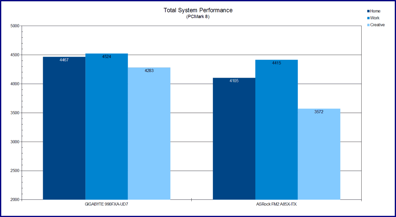 The results fit right into our expectations and show where the builds differ. The 4 additional cores will give the FX-8350/GA990FXA-UD7 an advantage in all tests were the CPU plays a major role. On the hand, both systems will be using the Nvidia GeForce 770, so any test with a GPU focus are relatively even. As you can see, when the CPU tasks are not that intense such as the work suite both motherboards are still close.