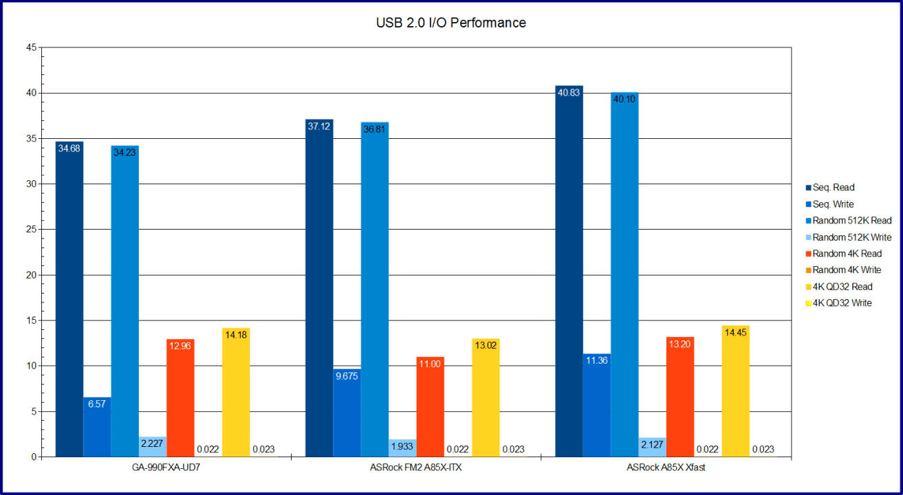 Now we are going to compare the I/O of the 990FXA-UD7 to the FM2A85X-ITX. This time we are going to include the XFast USB software in the results in addition to normal performance. This will give us a chance to show exactly what ASRock brings to the table.