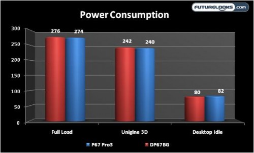 Intel motherboards are pretty low consumers of power. In fact, the DP67BG was the one that gave us that odd cold boot issue with a 1000 and 1200 watt power supply simply because it draws so little power at startup. The PSUs just wouldn’t initialize the system because it was waiting for a higher load.