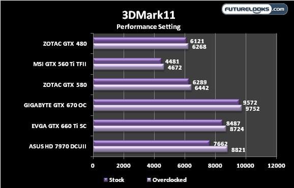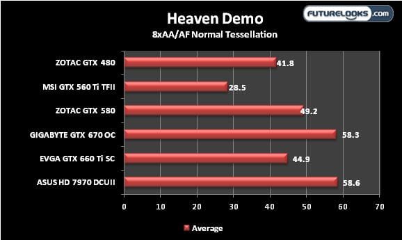 Here, performance is more along the lines of what we expect. It closes the gap on the very powerful GIGABYTE GTX 670 OC card. The ASUS driver was about 4 frames slower which isn’t much of a difference but we serious gamers demand the best results for our hard earned money.