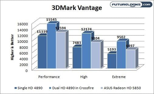 Moving over to 3DMark Vantage, we get to see the CrossFire rig pull ahead a little in the performance numbers. As we move higher up in resolution and detail settings, the old CrossFire rig gets a further leg up on the single HD 5850. However the HD 5850 still maintains a solid lead over the old HD 4890.