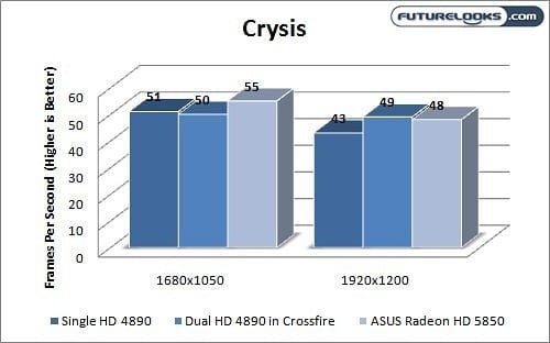 In our Crysis benchmarks, the ASUS Radeon HD 5850 managed to out-perform both the single and CrossFire HD 4890 setup at the lower of our two test resolutions. The higher resolution produced numbers similar to what we saw with the synthetic benchmarks. So I guess to really see the benefit of this card you need to push it hard. Really hard.