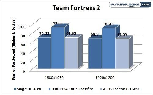 Team Fortress 2 produced even weirder results, with our timedemo scoring the Radeon HD 5850 lower then the 4890, and much lower then the CrossFire configuration. I re-ran the timedemo I recorded from a match with the crazy kids from Penny Arcade Forums, and found the same results kept popping up. I even verified the settings used, and there was no change from when we last tested a video card.