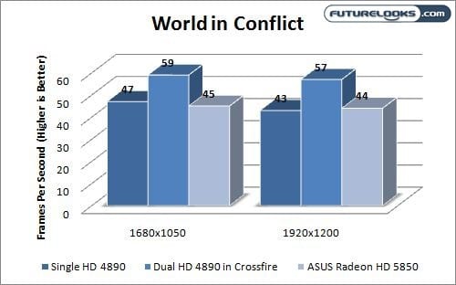 The ASUS Radeon HD 5850 seems to display a particular performance glitch we experienced with the DIAMOND card in CrossFire; there really isn’t much of a performance difference between the games. Tests were performed with Very High settings, and Vsync was double-checked to make sure it was disabled. This anomaly makes a quick judgment rather difficult.