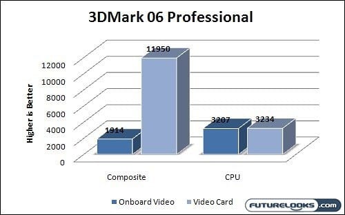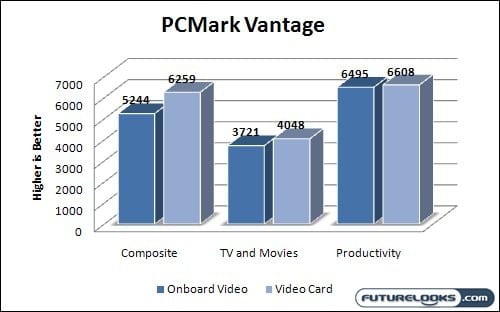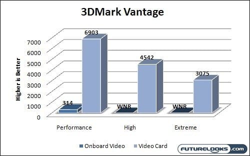 With the results of the 3-year-old 3DMark 06 in mind, in shouldn’t come as any surprise that the onboard video completely failed at 3DMark Vantage. This DX10 based suite treats even the most heavy duty 3D hardware in the most brutal of fashion. The onboard video had no change. There is still a positive spin to this story though.
