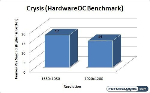So we’ve established that the onboard video isn’t the greatest, but we still need to see how this motherboard pans out in some real world game titles. We pushed forward with a couple of DX10 benchmarks, using the discrete video card chosen for our test bed throughout these final tests. First up was a run through on Crysis, using the HardwareOC benchmark program. We did 3 passes on the GPU specific tests, and tested the two major resolutions found on modern widescreen monitors.