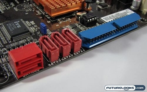 When it comes time to hook up drives, Asus has you mostly covered. I say mostly because of the strange number of SATA ports preset on the M4A79T Deluxe. Usually there’s an even number present like 4, 6, or 10, but on this board there’s 5 SATA ports. There’s also an IDE port next to the SATA ports. As for the way the ports are positioned, they shouldn’t cause any problems for most configurations. The ports that are at a right angle sit straight in line with the second x16 PCIe slot, and sit perfectly under a dual slot video card. The three straight up ports right next to those don’t interfere with the video card either.
