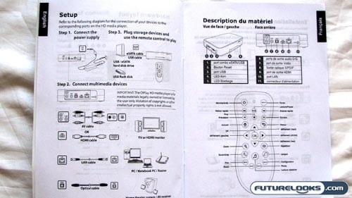 Cracking open the attractive box, you’ll find almost everything that you’ll need to get started. In addition to the O!Play HDP-R1 itself, there is the AC power adapter, remote with batteries, composite A/V cable, user manual on CD, and a Quick Start Guide.