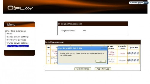 Let’s start with the good news. Unlike the Patriot Box Office, you don’t need to install any software on your computer to use the BitTorrent engine. You just dial into the IP address of the O! Play HD2 in a web browser on the same network.
