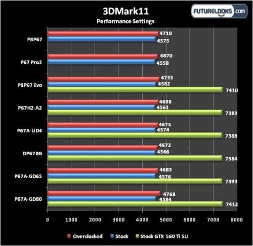 Once again, ever so slight BIOS and motherboard tuning give the P8P67 a strong score. Keep in mind if you want to run dual AMD HD 6870 video cards, the board has the capability.