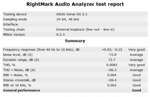 I also used the Xonar DG for several days before the RightMark tests with basic day to day uses such as watching movies, gaming, and playing music. I did this to minimize any bias due to expecting improvement based on test results; however, I want to start with those numbers.