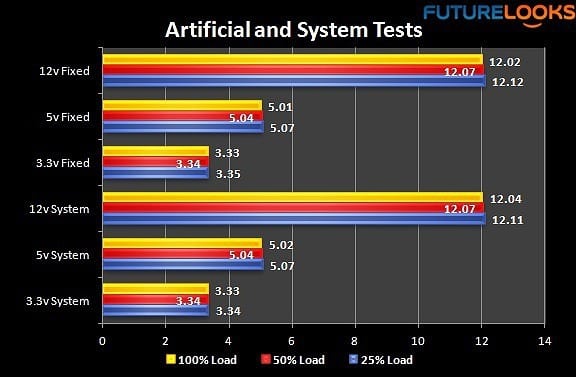 The unit was tested under two profiles: artificial and system load. Keep in mind that an artificial load does not draw power as a computer system. Instead, it pulls a steadier load for the most part. However, the system test is performed using the previously mentioned test system to check real world performance. It is not recommended that you power your system using “just enough” power but rather with at least 150 or more watts.