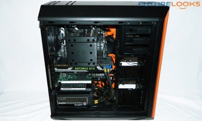 The entire list of hardware went inside with minimal issue. The oddest thing though is working with the orange rubber hard drive grommets. They’re pretty soft and flexible so they can flop around on you a little. The SSDs mounted well to the rear SSD trays however you can’t see them from outside which is kind of a shame. It might be neat to have a couple of small windows on the back panel of the chassis to show them off.