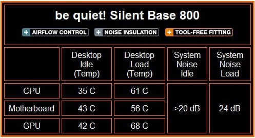 We’re happy to report that the temperatures did not climb to levels that resulted in noisy fans. The Silent Base 800 moves quite a bit of air throughout the chassis. Heat isn’t going to be a factor inside this chassis no matter what you put inside it. And the side benefit is that it will “be quiet”.