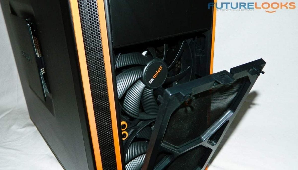 The front has orange vertical accents following the vents on each side. The bezel door has noise dampening material. The lower front of the bezel is also a padded toggle door that swings open revealing a dual fan filter and two front intake fans.