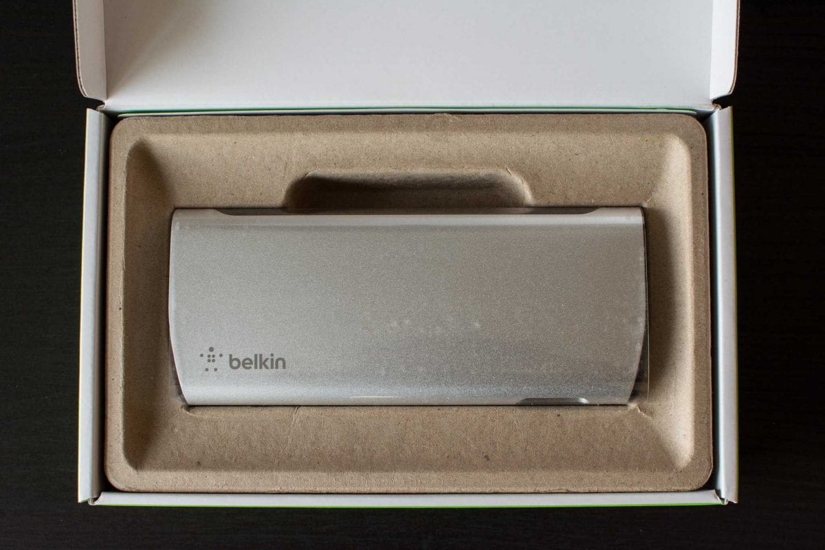When you open the box you are presented with the Belkin Thunderbolt 2 Express Dock HD itself nestled snugly in some molded recycled cardboard. Underneath that and the device, you can find the AC power cord, power brick and the included one-meter Thunderbolt cable.
