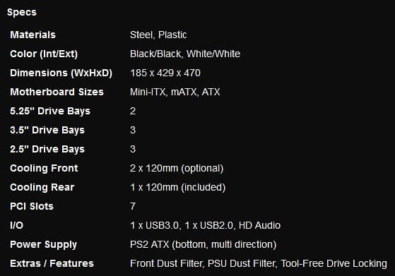 The specs list tells you just the amount of expansion you will have for building a system. There are a few attributes missing from the list though. First, the case has two rear rubber grommet holes for external tubing, has tool-less hard drive trays and bays, and is very light weight, yet feels sturdy enough to house a full case, without fear of crumbling under that weight.