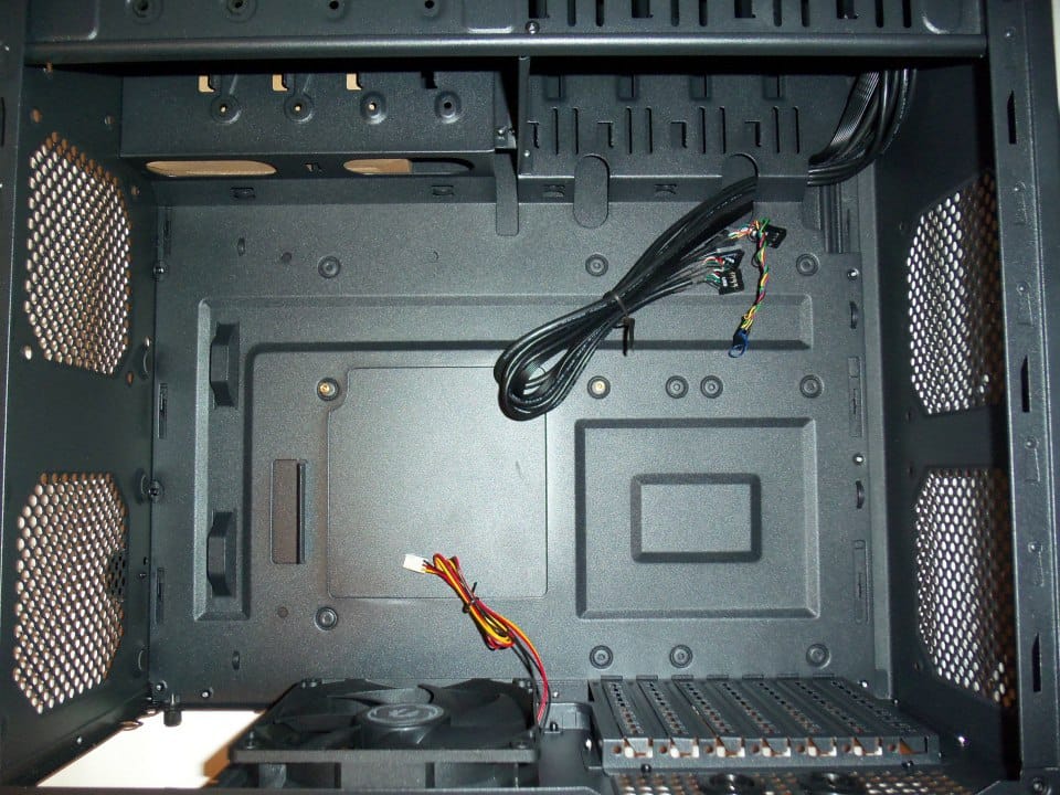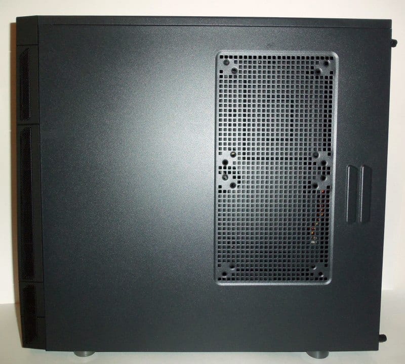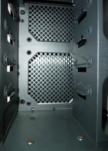 The first thing that struck me as strange was 4 drill holes for a single SSD at the bottom of the case, just under the HDD mounting area. This was clearly a move to save a little money and to reduce the size of the case. It is often the norm of more expensive models to either have a way to use any 3.5” slot for a 2.5” drive (those with drive trays), or provide a 3.5” to 2.5” adapter. This is actually a good idea for this size case as you could use an SSD and still maintain your four 3.5” drive bays to bring your total drives up to five.