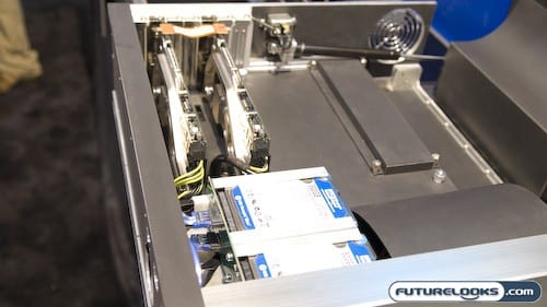 Although there wasn’t a new product on display, they did show off a couple of concepts. The first of which was a completely water cooled system built from the ground up. The system is totally sealed and resembles the engine bay of a Mercedes, which is sort of what they were after. Their premise for doing this build was to show off what is possible when you think water cooling from the ground up.