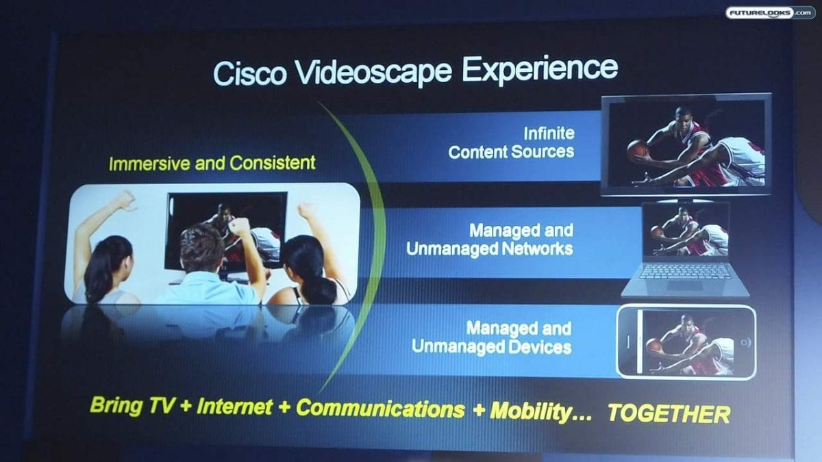Cisco tells us that “the network is the platform.” Instead of focusing on the hardware, Cisco is more interested in developing an architecture and software to support the ability to enjoy “any content on any screen.”