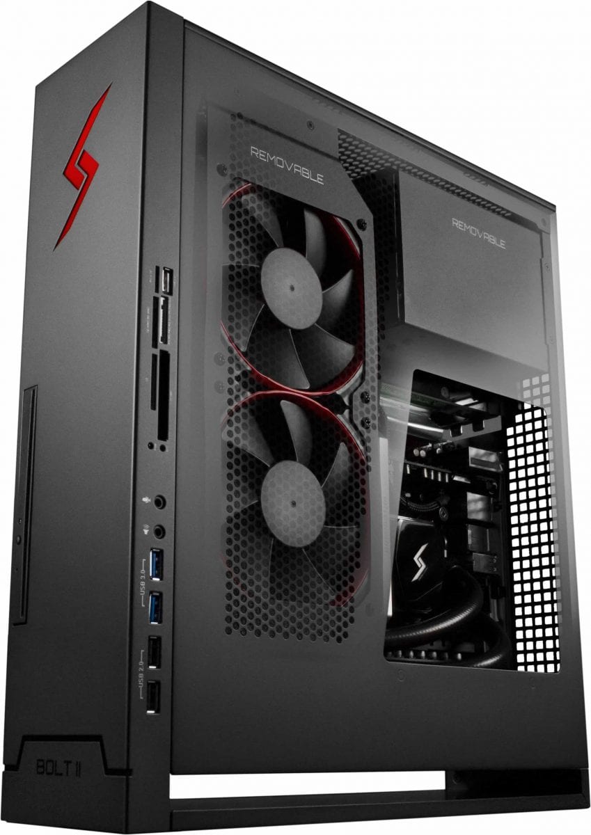 Bolt II defies the cookie-cutter mold of SFF systems by delivering performance that eclipses most full-size desktop PCs. Expertly engineered airflow design with large perforated ventilation areas over the graphics card, cooling system, power supply, and top panel transfer excess heat out of the system while pulling cold air in. A best-in-class 240mm radiator cools the overclocked processor, which drastically reduces system temperature making it the most thermally efficient SFF computer available.