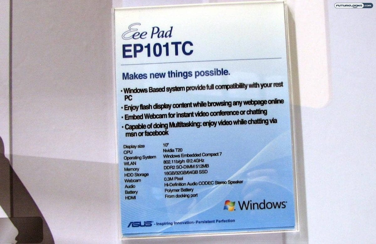 The Eee Pad EP101TC features a 10-inch display and works with Windows Embedded Compact 7. Interestingly, it uses an NVIDIA T20 processor to go with its 512MB DDR2 RAM and 16GB/32GB/64GB solid state drive. It has HDMI-out via the docking port too.