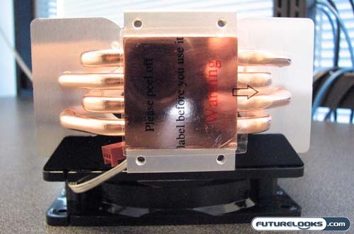 This little cooler looks at first like it’s passive and doesn’t sport any type of active fan, but there’s a power cable that leads to a 92mm fan sandwiched between the two cooling towers. While this is a good design and not unlike the Cooler Master Hyper 212, the 92mm fan in this OEM cooler sounds like a jet engine at top speed. It should be noted that the fan in the OEM cooler has a four pin connector, and can vary it’s speed based on the load and temperature of the CPU as reported by the motherboard. Since the Hyper 212 doesn’t sport this feature, we’re going to run both coolers at their top speed.