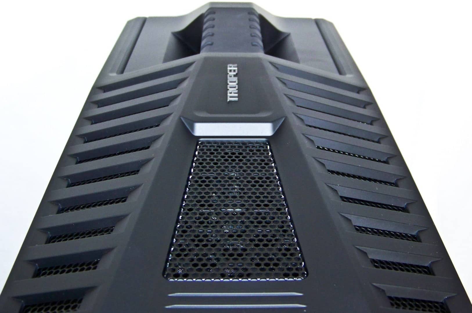 The CM Storm Trooper features a continual mesh front bezel with easily removable slot covers that hide the reversible 5.25″ drive cages which can be mounted side ways to from the front through an innovative mounting method. The very bottom case badge hides a tool tray handy for keeping your screws and extras with the case at all times. The case also sports a comfortable rubber handle that is seamlessly built in to the chassis capable of withstanding 95 pounds. And, if that isn’t enough, that great looking top is rubber coated to give it a special feel and resilience. Best yet, we’ve got a complete video walk through of most of these features in our initial unboxing and overview below…