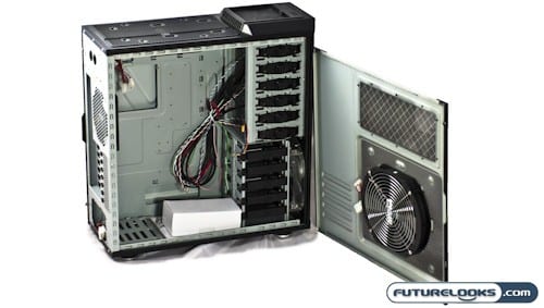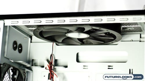 The top 230mm exhaust fan is pointed directly over the CPU area and like the other 230mm fans, spins at 1700RPM and pushes over 110CFM of air. The side panel fan can also be replaced with three smaller 120mm fans. Removing the fan also allows you to mount a radiator to the top of the case and take advantage of the fill port that is under the rubber mat.
