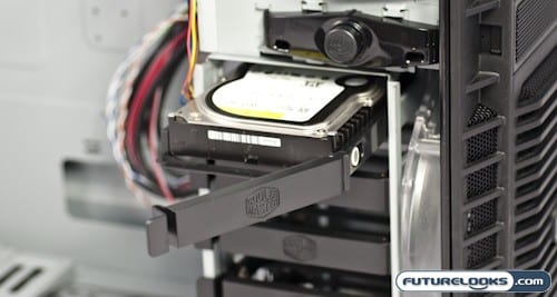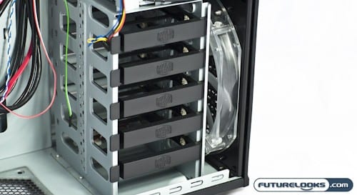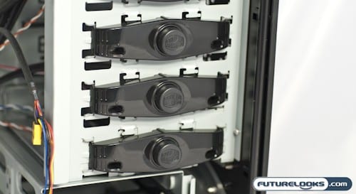 The hard drive bays used a completely tool free system that even combines rubber grommets for noise dampening purposes. The 90 degree mounting of the drives also provides more room in the motherboard area, giving you more space. Aiming the cables away from the motherboard area keeps the rats nest to a minimum. The 5.25″ drive bays all uses Coolermasters push button retention system, allowing me to quickly mount the optical drive.