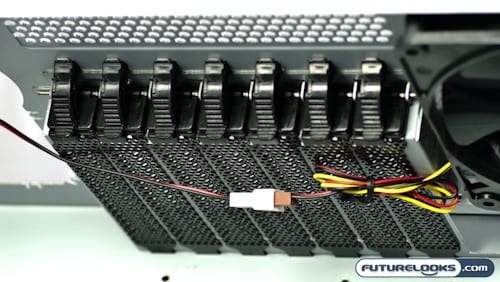 Tool free action is also available on the expansion slots using clips that rotate up to release the slot and then flip down to secure the expansion card. For the most part, it worked well, especially with dual slot video cards. However, I did find that the ASUS Xonar D2 Audio card mounted in the bottom slot had a tendency to slide down as there wasn’t enough pressure to secure the card properly. Coolermaster could easily solve this by adding a metal lip to the left of the final slot.
