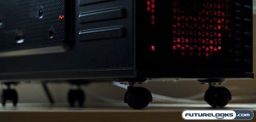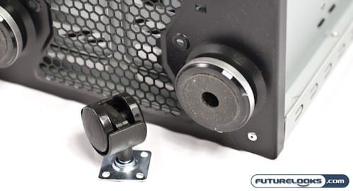 Once installed, they raise the bottom of the case up quite a bit. If you’re putting the case on carpet, you might want to install them anyway to increase air flow underneath the case. This is especially important if you choose to install the power supply at the top of the case and run two more optional 120mm fans. Wheel locks help you avoid having the case roll away.