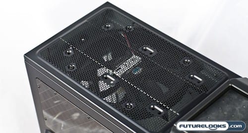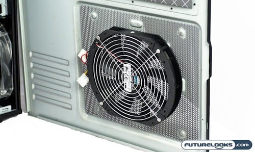The top 230mm exhaust fan is pointed directly over the CPU area and like the other 230mm fans, spins at 1700RPM and pushes over 110CFM of air. The side panel fan can also be replaced with three smaller 120mm fans. Removing the fan also allows you to mount a radiator to the top of the case and take advantage of the fill port that is under the rubber mat.