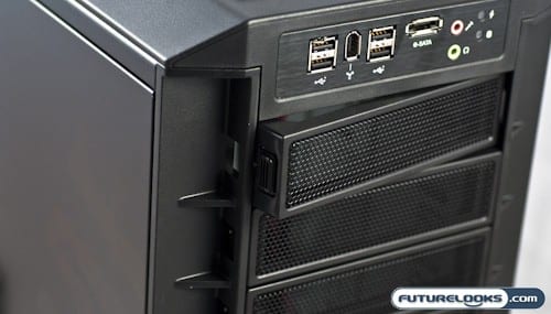 The front panel is mounted to the top of the case and features four USB 2.0 ports, a firewire port, eSATA and your standard microphone and headphones jacks: all of which are shielded to prevent interference from internal components. To the far right are your power and hard drive activity indicators, both of which glow blue. I would have preferred red and green so that you could tell them apart a bit better from a distance. The panel is finished off with a brushed aluminum faceplate.