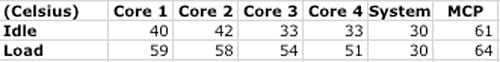 Idle conditions were established after booting into the desktop and lettings things settle for 30 minutes while load conditions were established using a looping run of 3DMark Vantage and taking the highest logged temperature. Ambient temperature at the time of these reading was 23C.
