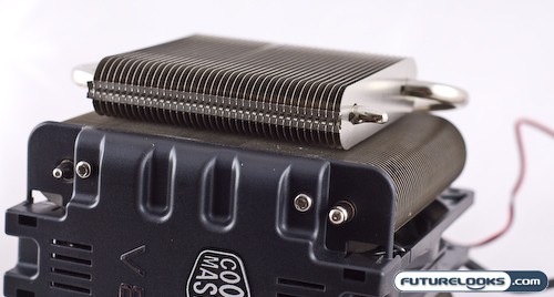 As mentioned, the CoolerMaster V8 sports eight heatpipes hence the V8 designation. They extend up from the copper baseplate to the four seperate aluminum heatsink panels.