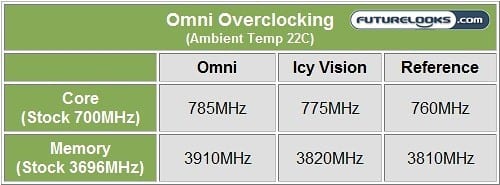The only time the Omni’s fan spun to max was during Furmark where it topped out at 42dB. Otherwise, the average noise was in the area of 26dB measured two feet from the back of the case. However, the GELID Icy Vision produces much less noise than all three test subjects. Still, the Omni is much quieter and much cooler than the stock reference cooler and the GELID in overall general use.