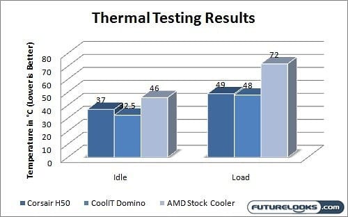 As I’m sure you’ve figured out from my multiple mentions of it, the Corsair H50 pretty well is meant to be put head to head with the CoolIT Domino. The end result was an overall win for the Domino, but still a net positive for the Corsair H50. In raw numbers the Domino was definitely cooler then the H50, but it wasn’t that much cooler.