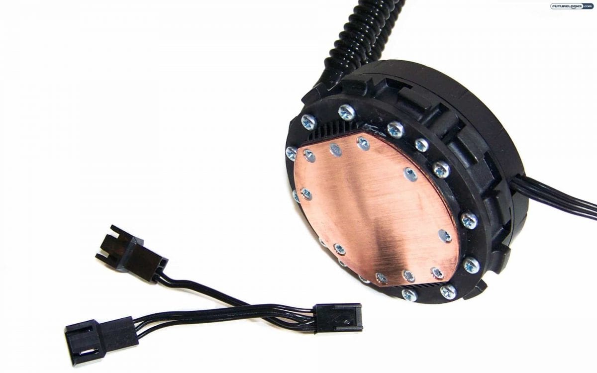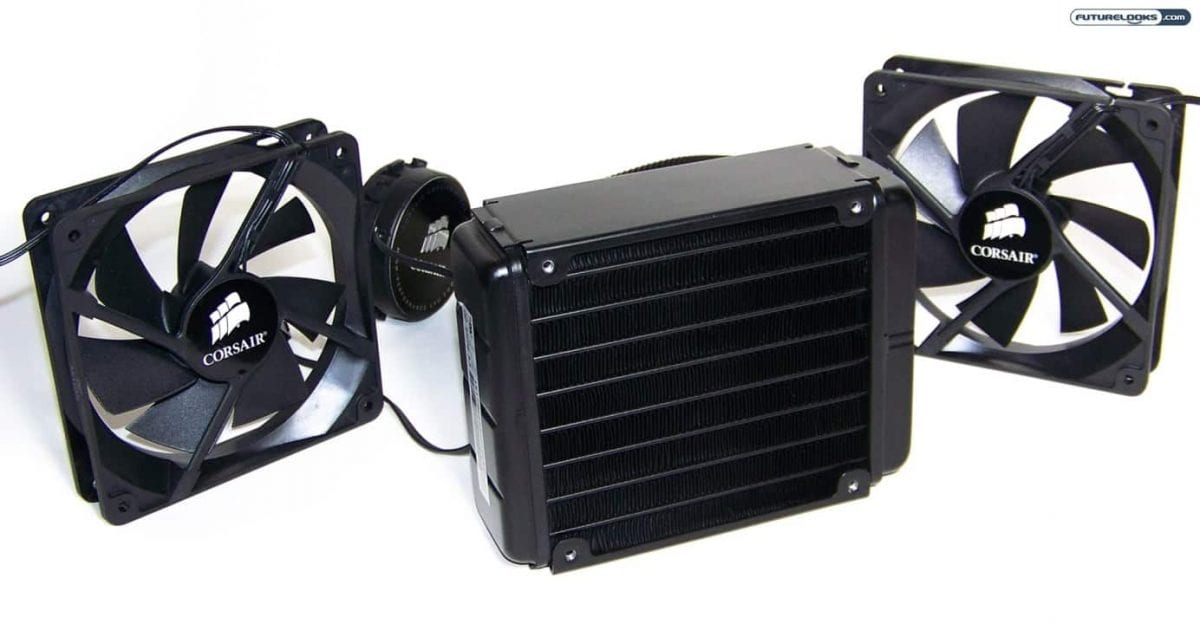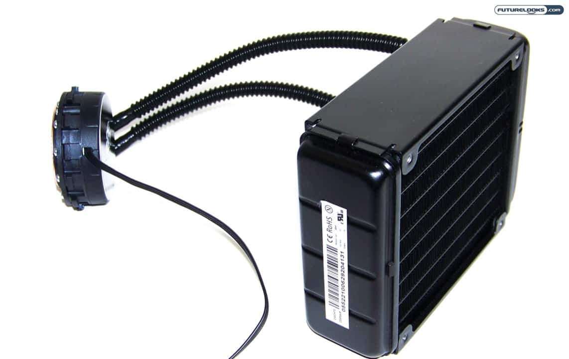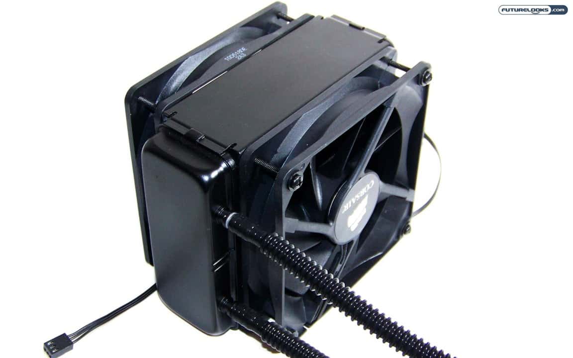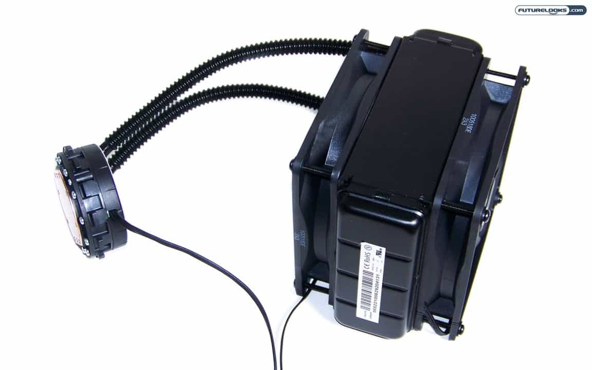 That double thick radiator is cooled by two 120mm fans rated to about 50-61 CFM (cubic fee of air per minute) emitting roughly 26-31 dBA of fan noise each. The dual 120mm cooling fans cool the radiator in a “push-pull” configuration. This is the method for making sure the entire radiator gets hit with cool air at all times.