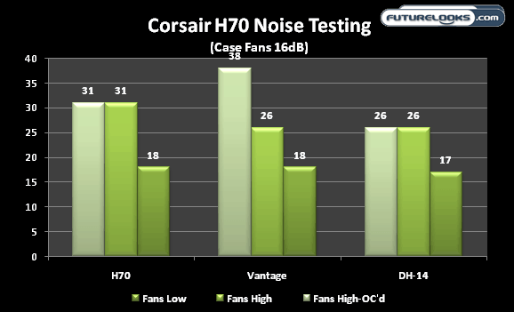 While some of you won’t overclock your computer, it’s here that you get to see the brute cooling potential of these coolers. For instance, the once quiet Vantage finally has to rev its single 120mm cooling fan up to try and control the higher liquid temps creating a 43 dBA wall of noise completely surpassing the H70 with its meager 31 dBA. The Noctua NH-D14 was much quieter than both but really held it’s own as one of the best air coolers on the market today.