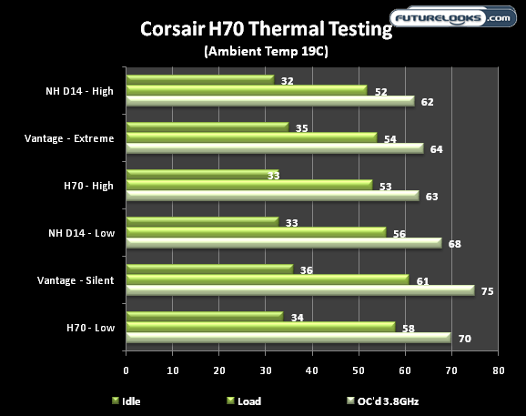 I’m not surprised to see the dual fan H70 out cool the single fan Vantage ALC. It’s because the Vantage’s fan speed is dictated by the liquid’s temperature automatically with no manual control over the fan speed. Unless those coolant temps start to hit 40-45 C, the fans won’t quite hit max. It’s only when overclocking do we get to see a bigger difference in performance.