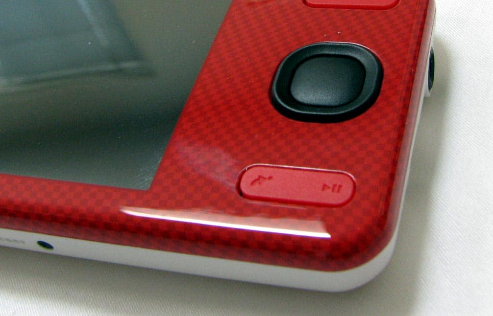 Always to be held in landscape orientation, this portable media has a five way navigator to the left of the screen, as well as a pair of two-button modules: one above and one below. On each of these modules are two little icons, indicating that the buttons are used to access the menu, go back, play/pause, and so forth.