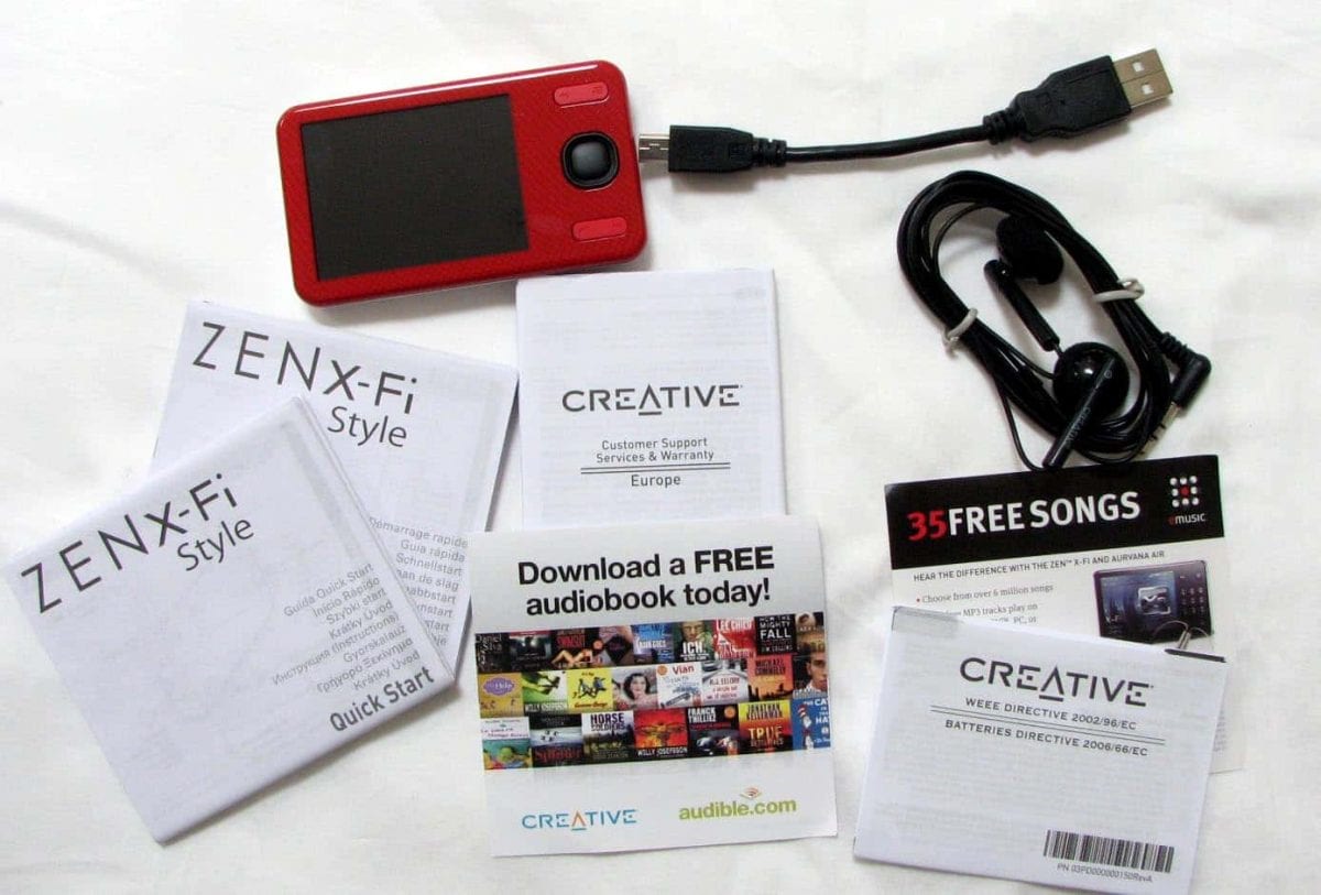 Cracking open the retail packaging (which is still that terrible plastic blister pack thing), you’ll find the Creative ZEN X-Fi Style itself, of course. Aside from that, you get a very basic set of ear buds, a mini-USB to USB cable, and a series of documentation. There are redemption codes for a free audiobook and 35 free songs too.