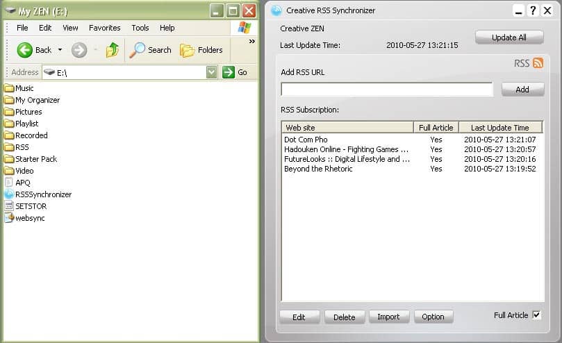 Drag and drop your music in the Music folder, pictures in the Pictures folder, and so on. That’s simple enough, but some people may prefer using a more conventional “sync” software package; that’s up to you. One of the more unique features of the ZEN X-Fi Style is that it is capable of synchronizing with RSS feeds. It doesn’t have Internet connectivity on its own, so it will only sync when it’s connected to your computer. Add the feed URL, hit Update All, and you’re good to go.