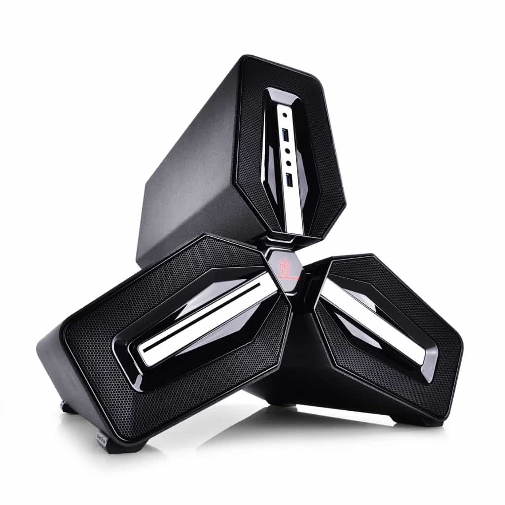 The DEEPCOOL Tristellar is sports three independent “lobes” that help separate the hottest components of the system, namely the CPU, GPU. The case supports a mini-ITX motherboard in the top most “lobe”, and up to 2 x 3.5 inch drives in the main motherboard cabin, with a lower profile CPU cooler, or a liquid cooling system as an option, instead of the two drives. With a competent liquid cooling system mounted, you could put up to a Core i7 CPU onboard. The front panel USB and audio jacks are placed at the front.