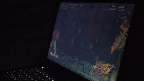 I understand that a laptop isn’t going to have 178-degree viewing, but with as little as a 30-degree deviation from straight-on viewing, I experienced significant loss in quality and “washing out” of the image on the screen. You can see that in the image above, taken during the Street Fighter IV benchmark (which I’ll get to in a moment). This can prove very frustrating when you have a “hey check this out” moment with your nearby friends.