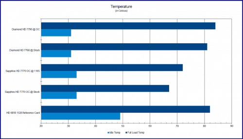 This test should be taken with a grain of salt as it is being compared to cards with either fewer shaders or a different architecture. The HD 7790 is indeed much hotter at full load, but it is well within AMD specs. The Diamond HD 7790 even comes in as the lowest temperatures at idle which should balance out the stress on the components to some degree. The Diamond HD 7790 was also just as quiet as the HD 7770 solution while being a higher performance part.