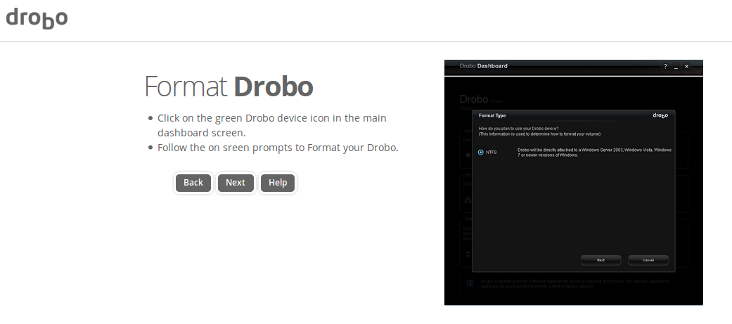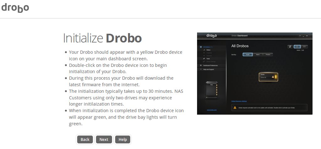 Drobo has a great online tool for setting up your Drobo. Their interactive setup is very easy to follow.